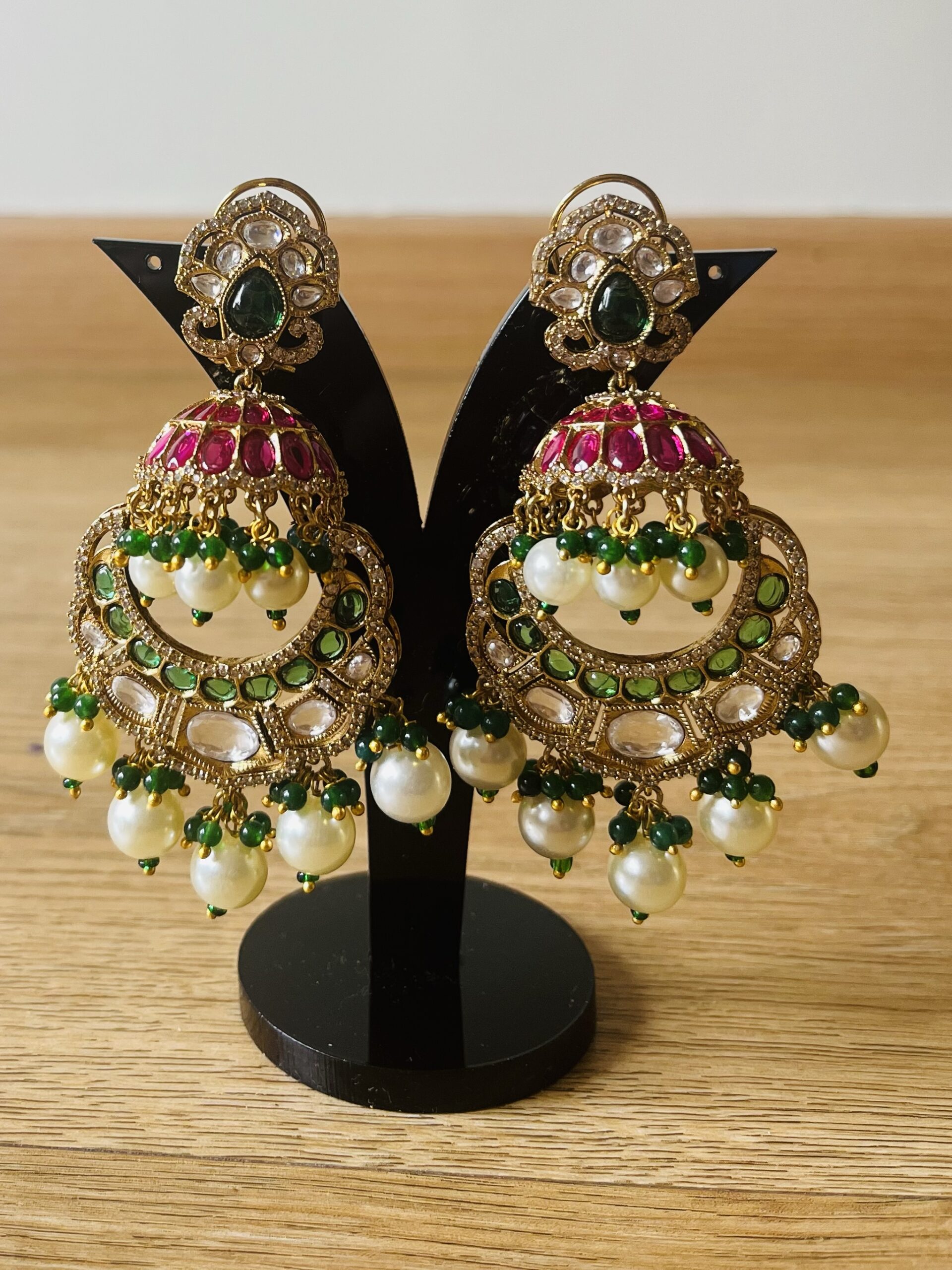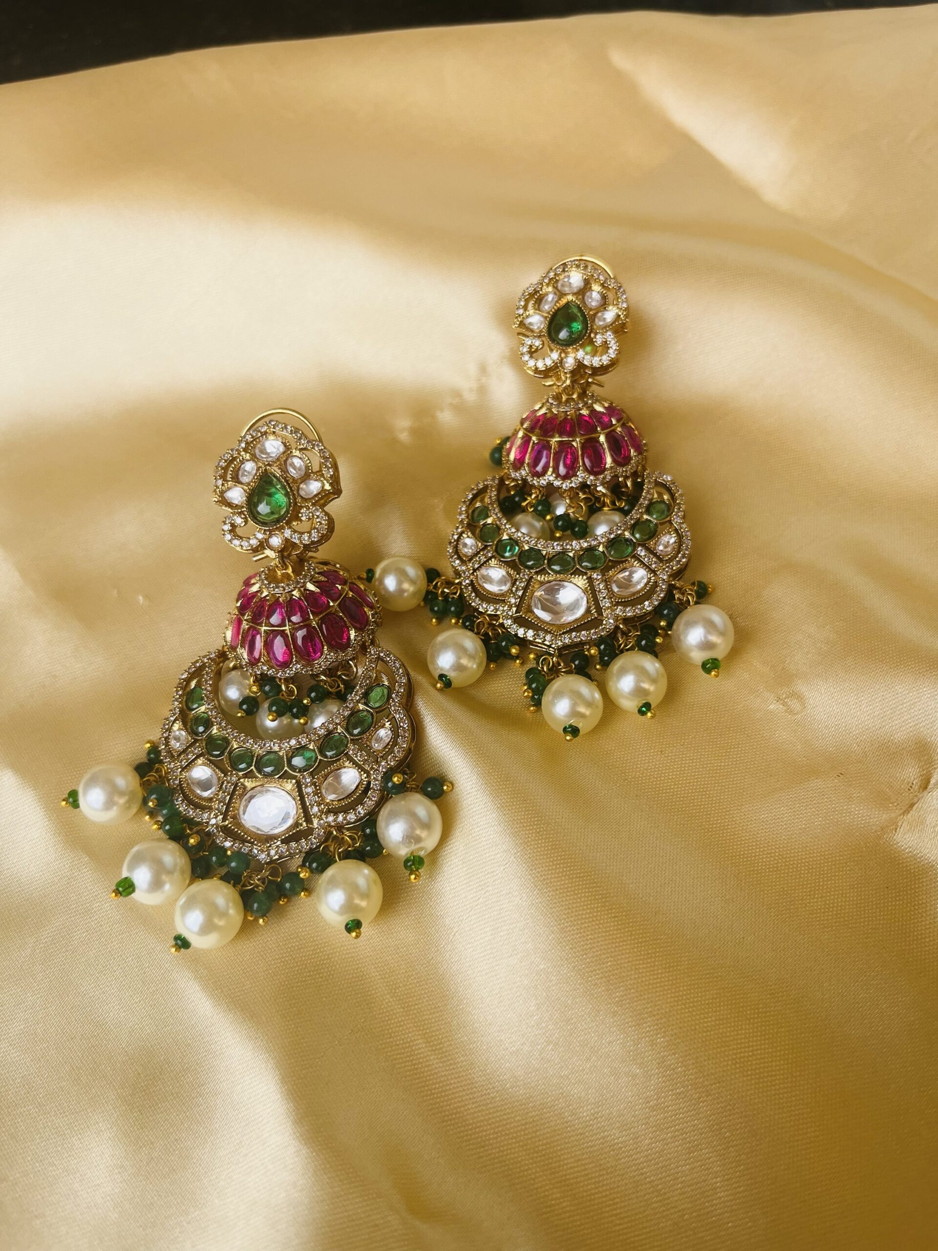This lovely earring with chand Bali and jumka together setting done with emeralds and ruby which is light in weight.