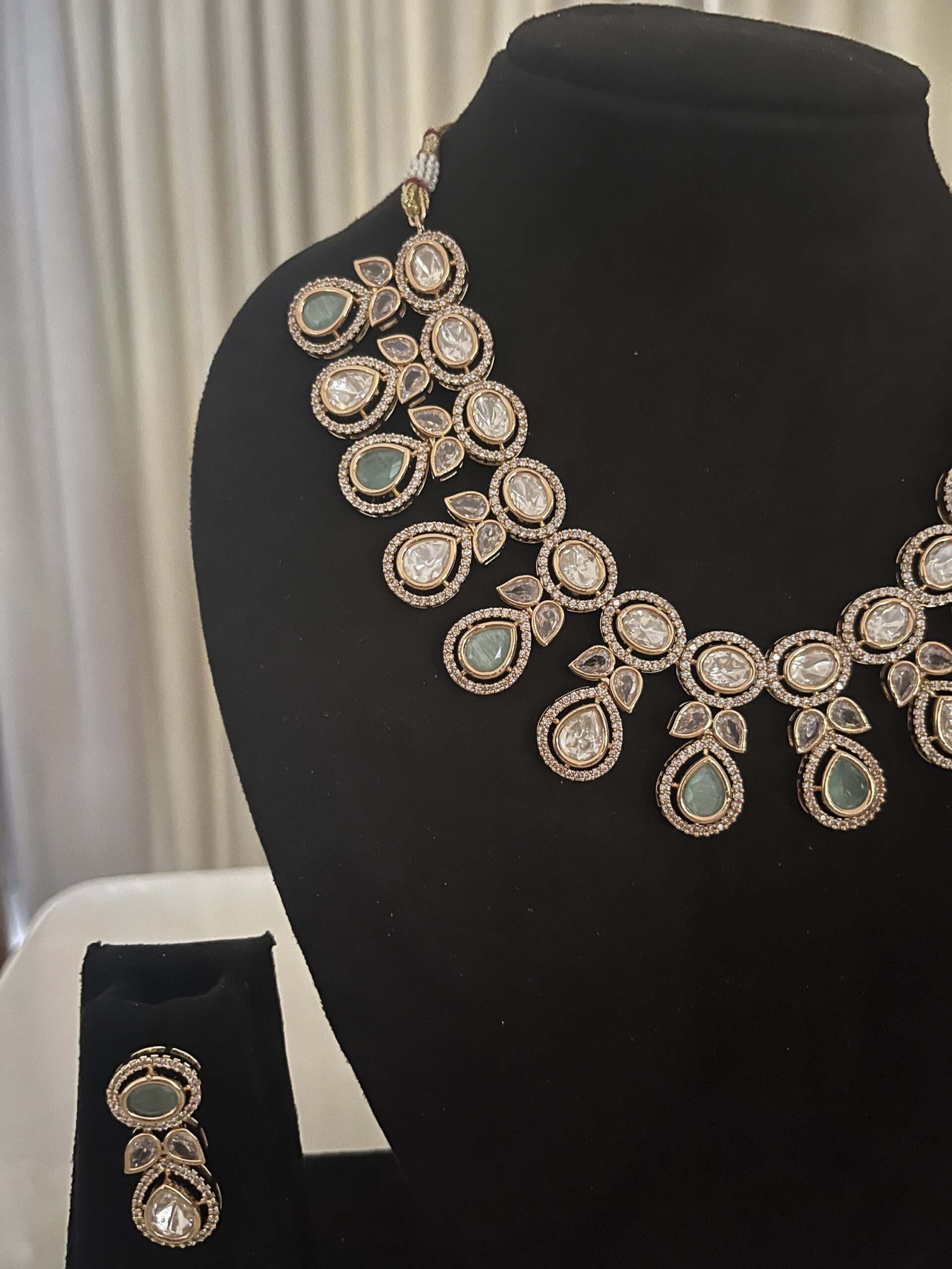 This Elegant, bold, and beautifully crafted brass necklace which is polished in 18kt gold completes the bridal look. It is anti tarnish. Light in weight. A setting which is done with mozznite and cz stones completes the look.